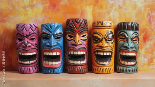Colorful wooden masks depicting laughing faces on shelf indoors