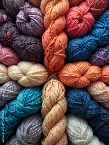 Colorful yarn skeins arranged symmetrically for crafting