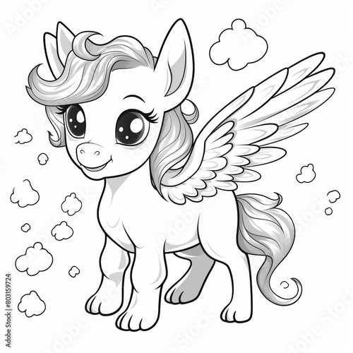 Coloring book page for kids of a cute cartoon unicorn with wing.