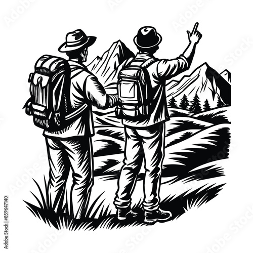 coloring book two guys hiking from behind who are pointing to something in the distance vector art illustration