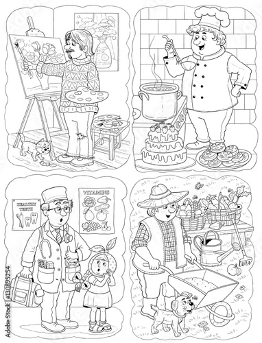 Coloring page. Professions. Cute artist, cook, doctor and farmer