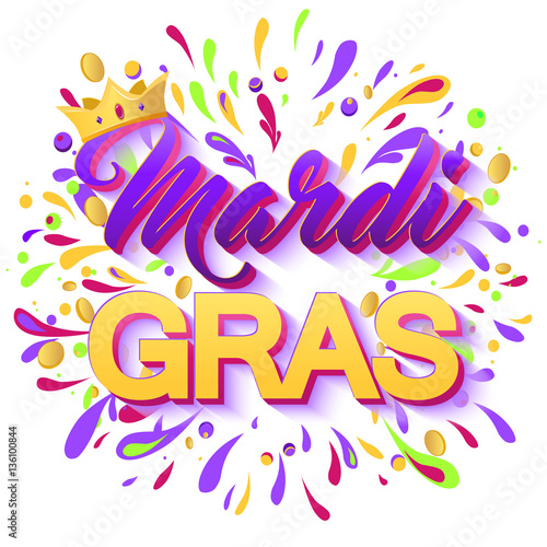 Colourful Mardi Gras carnival banner with lettering and crown. Explosion of beads, spatter, doubloons. Holiday poster or placard template.