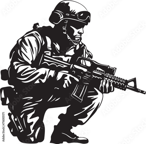 Combat Defender Vector Black Icon Design for Soldier with Gun Logo Tactical Vigilance Elegant Black Iconic Soldier Holding Gun