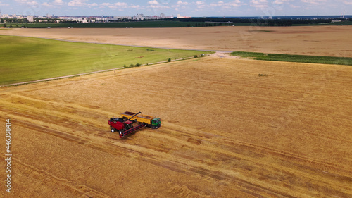 Combine harvester on the field. Grain harvesting. Transfer of grain from the bunker of the combine to the truck. Aerial photography.