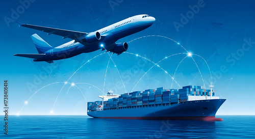 Combined Air and Sea Freight Transport — Multimodal Shipping Illustration of Airplane Over Container Ship for Integrated Logistics
