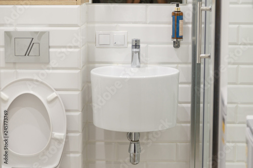 Combined contemporary white bathroom with toilete.