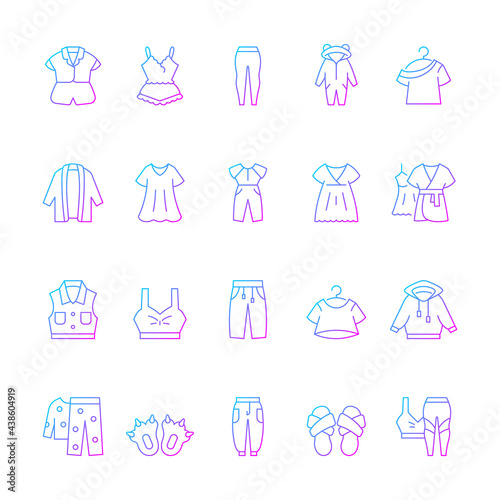 Comfortable homewear and sleepwear gradient linear vector icons set. Female nightwear. Male sportswear. Thin line contour symbols bundle. Isolated vector outline illustrations collection