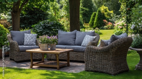 comfortable wicker garden furniture with grey pillows in beautiful backyard no logos no brands ar 169