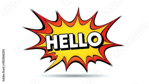 Comic book style speech bubble with hello text in bold letters on explosive starburst background for greeting cards and social media posts.