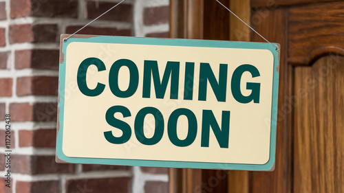 "Coming Soon" Hanging Sign on Wooden Door with Brick Background