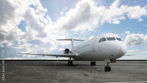 Commercial airplane on the runway with a blue sky background