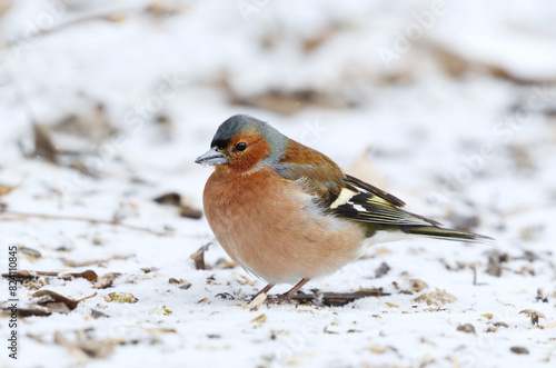 Common chaffinch (Fringilla coelebs) male in the garden looking for food in early spring.