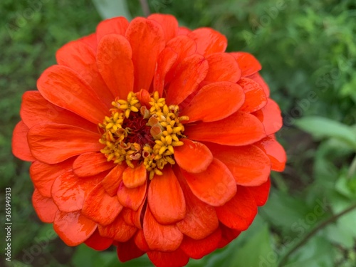 common zinnia Multi-layered orange petals with yellow stamens in the middle. Green leaf stalk
