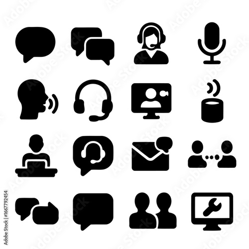 Communication Icon Set: A cohesive collection of black icons, meticulously designed to represent a broad range of communication concepts and digital interactions.