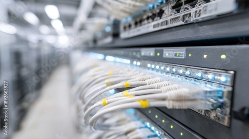 Communication network cables creating connections in server room racks. Representing data transfer, networking, and it infrastructure