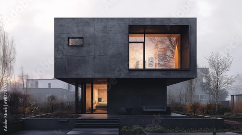 Compact modern cube house, dark gray concrete exterior, sleek horizontal windows reflecting soft light, set against a neutral sky backdrop
