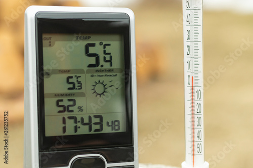 comparison of home weather station and thermometer readings with blurred background close-up
