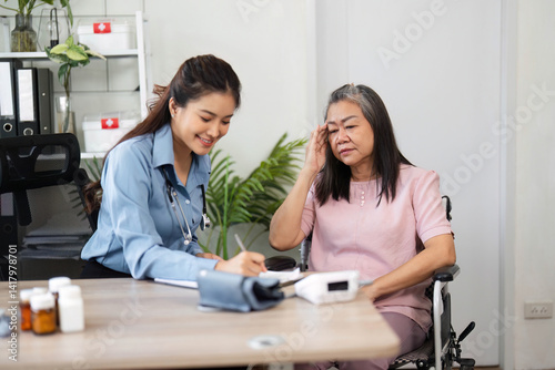Compassionate Care and Interaction. A nurse records vital signs while supporting an elderly patient in a comfortable environment.