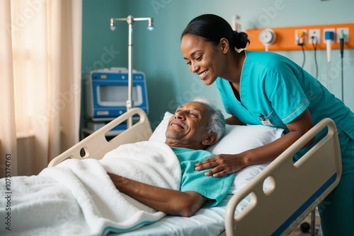 Compassionate Care: Nurse Comforting Elderly Patient in Hospital Room