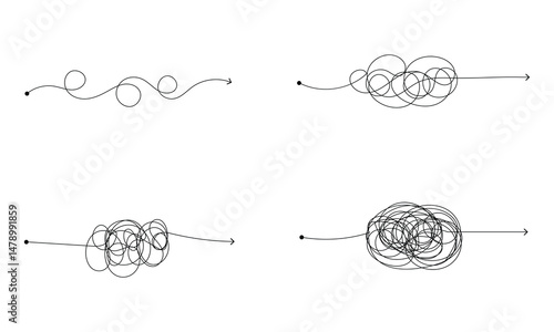 Complex and easy simple way from start to end vector illustration set. Chaos simplifying, problem solving and business solution searching challenge concept. Hand drawn doodle scribble chaos path lines