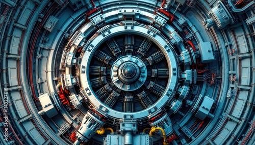 Complex nuclear reactor dome. Closeup view shows intricate control rods, advanced cooling systems in place. Complex piping, safety equipment evident. Modern tech design, safety features apparent.