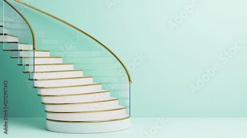 Complexity geometry and detailed, A sleek, modern spiral staircase with a glass railing, set against a soft mint green wall, creating a stylish and airy atmosphere.