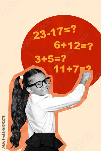 Composite 3D photo collage design trend of sticker young schoolgirl smile write maths numbers september academic class university student