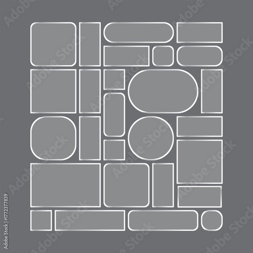 Composition displays variety of gray shapes with white borders on a solid gray backdrop