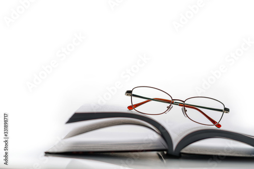 Composition with an open book and glasses on a white background with space for text.