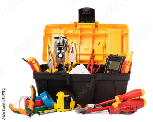 Composition with electrician tools and accessories isolated on white background. Tool box. Electrician's tool. Banner.MOCKUP