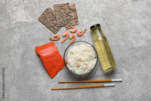Composition with ingredients for preparing tasty sushi rolls on grunge background
