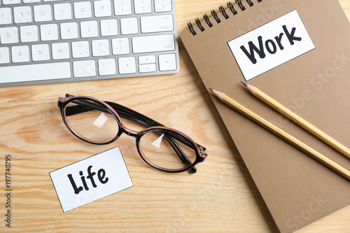 Composition with words WORK, LIFE and glasses on wooden table