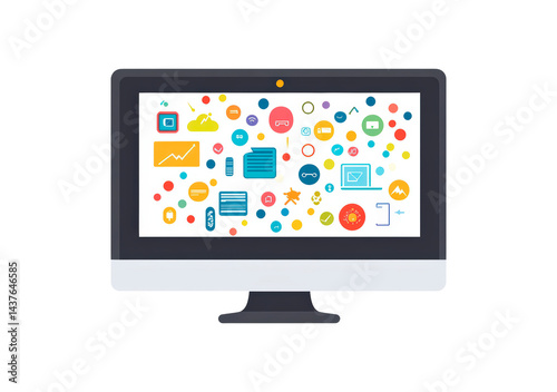 computer monitor displaying a colorful app icons isolated on transparent background