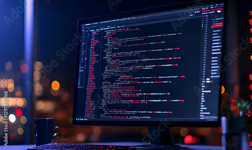 Computer Monitor with Code on Screen Against City Night Backdrop