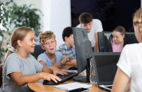 Computer science lesson in a school computer class - a girl and a boy solve problems on the computer together