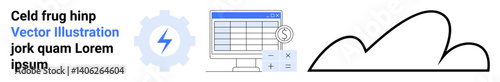 Computer screen with table, cloud icon, financial symbols, and gear representing data storage, collaboration, analysis, automation, cloud computing, financial planning and simple landing page