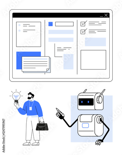 Computer screen with user interface man holding light bulb, robot holding pen. Ideal for technology, innovation, user experience, AI, productivity, creative thinking, futuristic concepts. Line