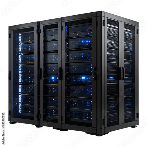 Computer server rack, dark metallic cabinets with blue lights, data center aesthetic