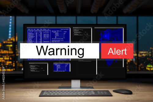 computer workstation in dark night office with skyline view warning cyber alert, 3D Illustration