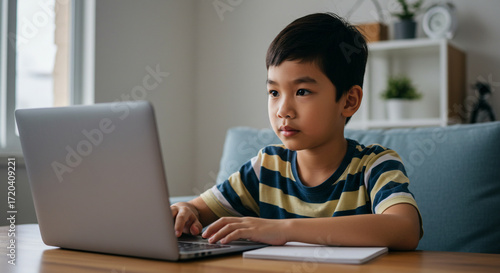 Concentrated asian boy studying online with laptop and typing on keyboard