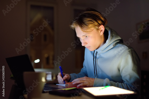 Concentrated teenager studying late night at home office with laptop and tablet.