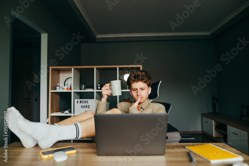 Concentrated young male boss in shirt and shorts on legs sitting in a chair at home and working on laptop, raised his legs on the table and looks focused at the screen. Comfortable remote work at home