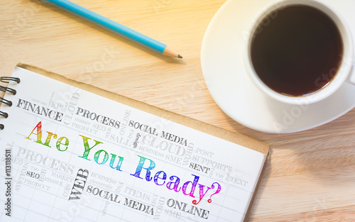 Concept Are You Ready? message on book. A pencil and a glass coffee table.Vintage tone.
