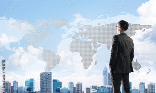 Concept of business success and control with confident boss against cityscape background