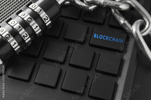 Concept of distribution network technology blockchain. Lock, chain keyboard. characters on remote keys. Blockchain enter key