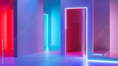 Concept of lighting different tones in the interior and changing the atmosphere. Blue and red light with white wall