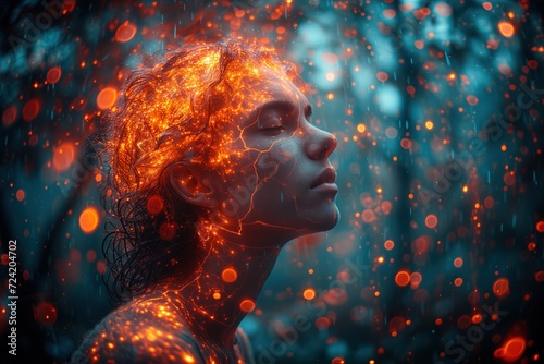 Concept of nervous activity, visualization of pain sensations passing from a guy’s brain through his face and body, affecting the surrounding space with an orange pulsating light