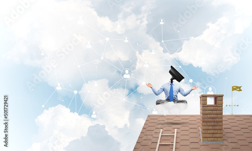 Concept of security and privacy protection with camera headed man meditating