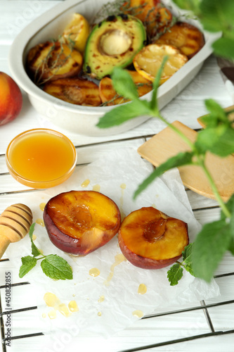 Concept of tasty food with grilled peach on white wooden table