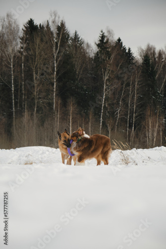 Concept pets have fun in nature without people. Two dogs best friends playing in winter snow park together. Australian and German Shepherd active and energetic dog breeds. Game tug of war.